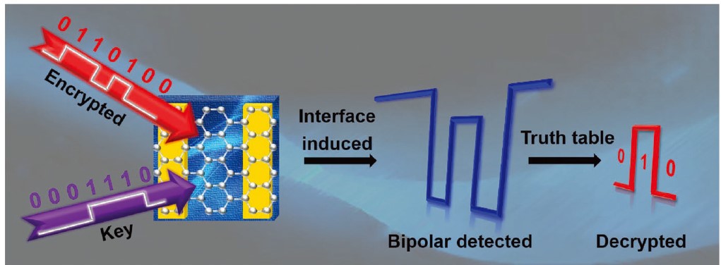 陈珊珊教授和中国电子科技集团第十三研究所周幸叶(共同通讯作者)等合作开发了一种基于石墨烯/GaN异质结双极性光电探测器。发现石墨烯/GaN异质结构中界面诱导效应,使其对紫外和红光展现出明显的双极性特征,能够依据紫外、红光的开关状态展示出了四种高低稳定的光电流。据此,研究人员进一步提出“两把钥匙开一把锁”的加密思路,将信息分别隐藏在紫外和红光两束光波中,只有当两束光同时入射至探测器上,根据编码协议即可解密出完整的光信息(图1)。该技术可推广至可见光和近红外波段,为自由空间安全光通信提供了一种新的加密策略。