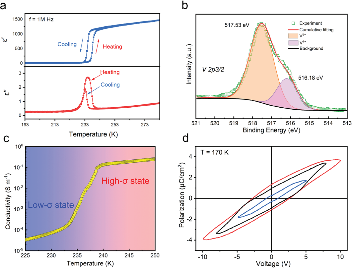 实验表明,材料在相变温度(234.4 K)附近电导率骤降三个数量级,同时介电常数跃升百倍。通过压电力显微镜(PFM),团队观测到可逆的电极化翻转,证实铁电性源于有机阳离子的有序化排列。密度泛函理论计算进一步揭示,低温相中钒离子形成电荷密度波(CDW),打开约0.34 eV的莫特带隙,而高温相因电子离域呈现金属性。这种“铁电序调控电子关联”的机制为多功能器件设计提供了新思路。