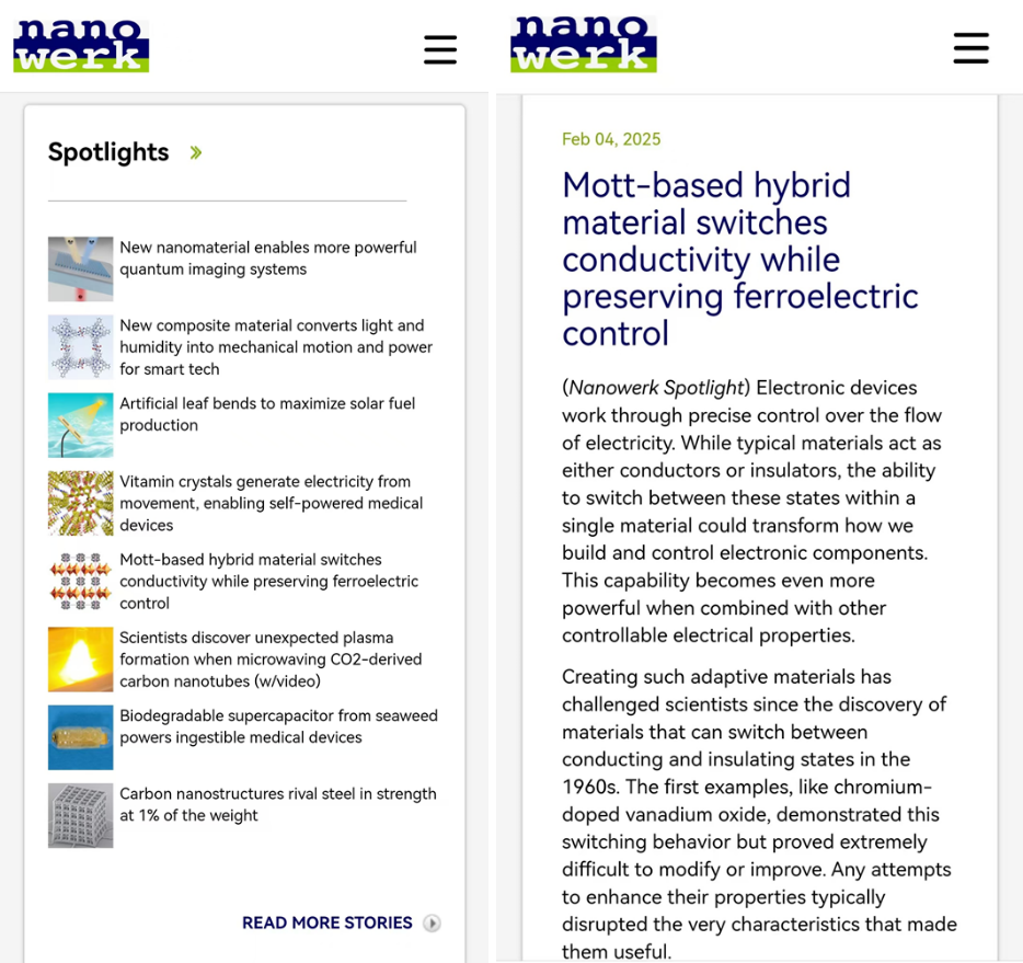 目前,该研究工作发表后受到了科学界的广泛关注,被选为了纳米科学与技术网站“Nanowerk”的“Spotlight”,并发表评论“This work establishes new possibilities for developing materials that integrate multiple useful properties in unprecedented ways.”。