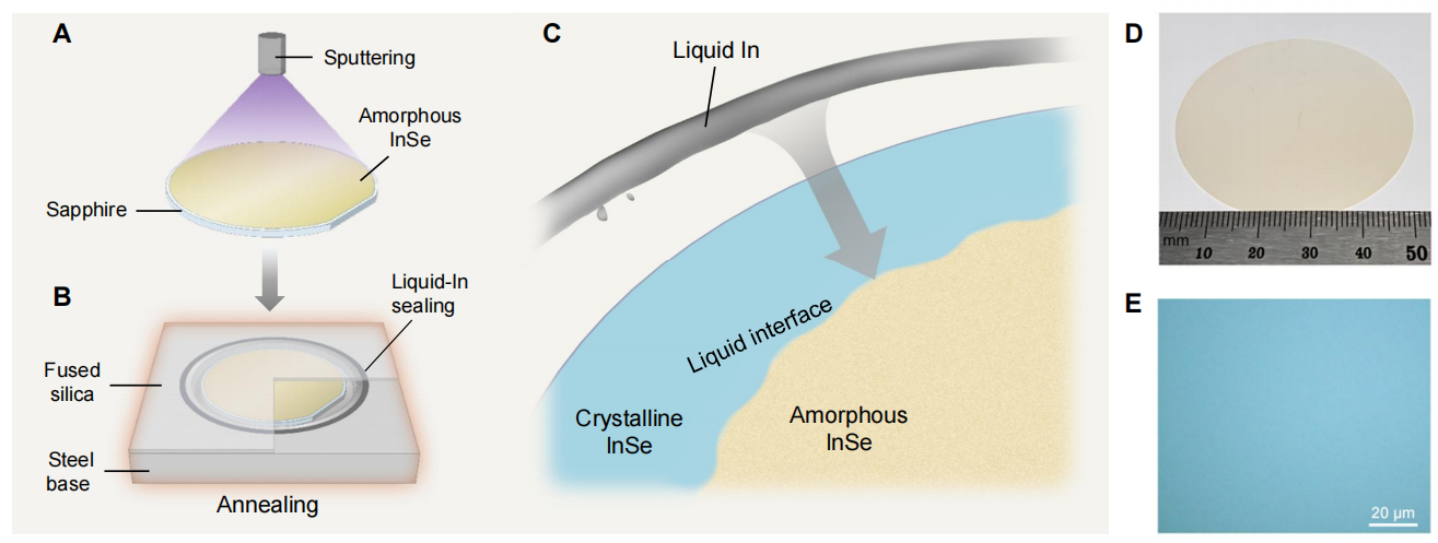 针对上述挑战,研究团队创新性地提出“固–液–固”二维InSe半导体制备策略,成功攻克了晶圆级InSe材料纯相、高质量制备的关键难题。具体而言,研究团队首先通过磁控溅射技术,在蓝宝石衬底上沉积非晶InSe薄膜,确保前驱体化学计量比为1:1。随后,在高温下(~550℃),利用低熔点液态In(熔点约157℃)包覆晶片边缘,结合熔融石英构建液封空间,防止成分挥发。另外,液态In高温下,少量In原子进入固态InSe非晶薄膜,形成富In液态界面。在该密闭反应体系中,非晶InSe在富In液态界面发生溶解–再结晶过程,促进高结晶度、纯相InSe晶膜的形成。最终,团队制备出厚度均匀、相结构单一、晶体质量优异的2英寸InSe晶圆。