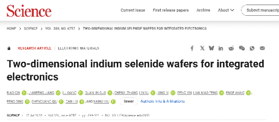 刘开辉教授、电子学院邱晨光研究员等团队合作,提出“固–液–固”材料制备新策略,首次实现了高质量二维硒化铟(InSe)半导体晶圆的制备。该材料展现出优异的电学性能,在晶体管阵列中实现了极高的迁移率与接近玻尔兹曼极限的亚阈值摆幅,并在超短沟道(10 nm以下)器件中,其关键参数—包括工作电压、栅极长度、漏致势垒降低(DIBL)、电子有效质量、开/关比和室温弹道率等,全面优于目前最先进的英特尔3纳米节点技术。2025年7月18日,相关成果以“用于集成电子学的二维硒化铟晶圆”(Two-dimensional indium selenide wafers for integrated electronics)为题,在线发表于《科学》(Science)。