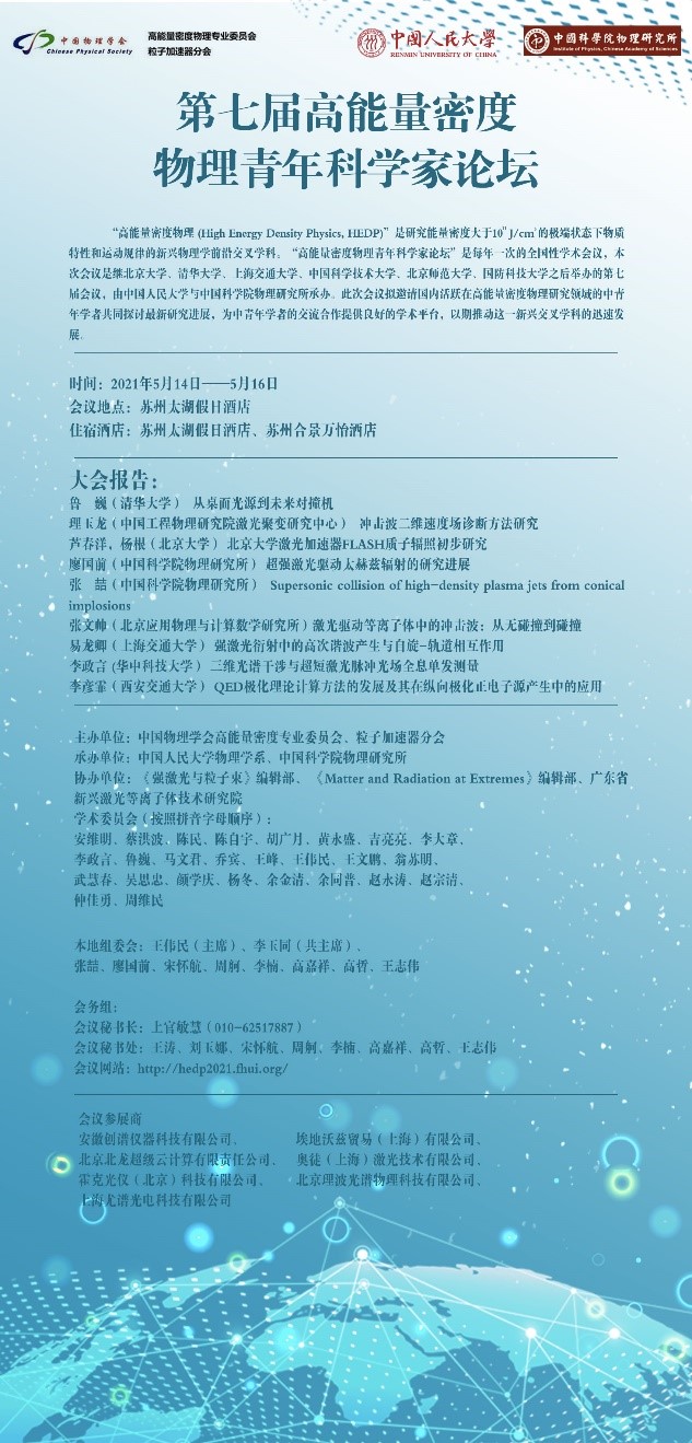“高能量密度物理 (High Energy Density Physics, HEDP)”是研究能量密度大于1011 J/m3的极端状态下物质特性和运动规律的新兴物理学前沿交叉学科。随着高能量高功率激光技术的突飞猛进,实验室激光装置能输出106焦耳量级的纳秒激光脉冲,104焦耳量级的皮秒、拍瓦激光脉冲,102焦耳量级的飞秒、十拍瓦激光脉冲(峰值强度可达1022 W/cm2)。这为人们在实验室条件下进行极端物理状态的自主可控研究提供了重要的实验手段。HEDP研究对惯性约束聚变、加速器物理、天体物理、医学物理、材料物理等具有极其重要的意义。近年来高能量密度物理的研究取得了令人瞩目的发展。“高能量密度物理青年科学家论坛”由中国物理学会高能量密度物理专业委员会、粒子加速器分会主办的每年一次的全国性学术会议,本次会议是继北京大学、清华大学、上海交通大学、中国科学技术大学、北京师范大学、国防科技大学之后举办的第七届会议,由宅宅爱动漫